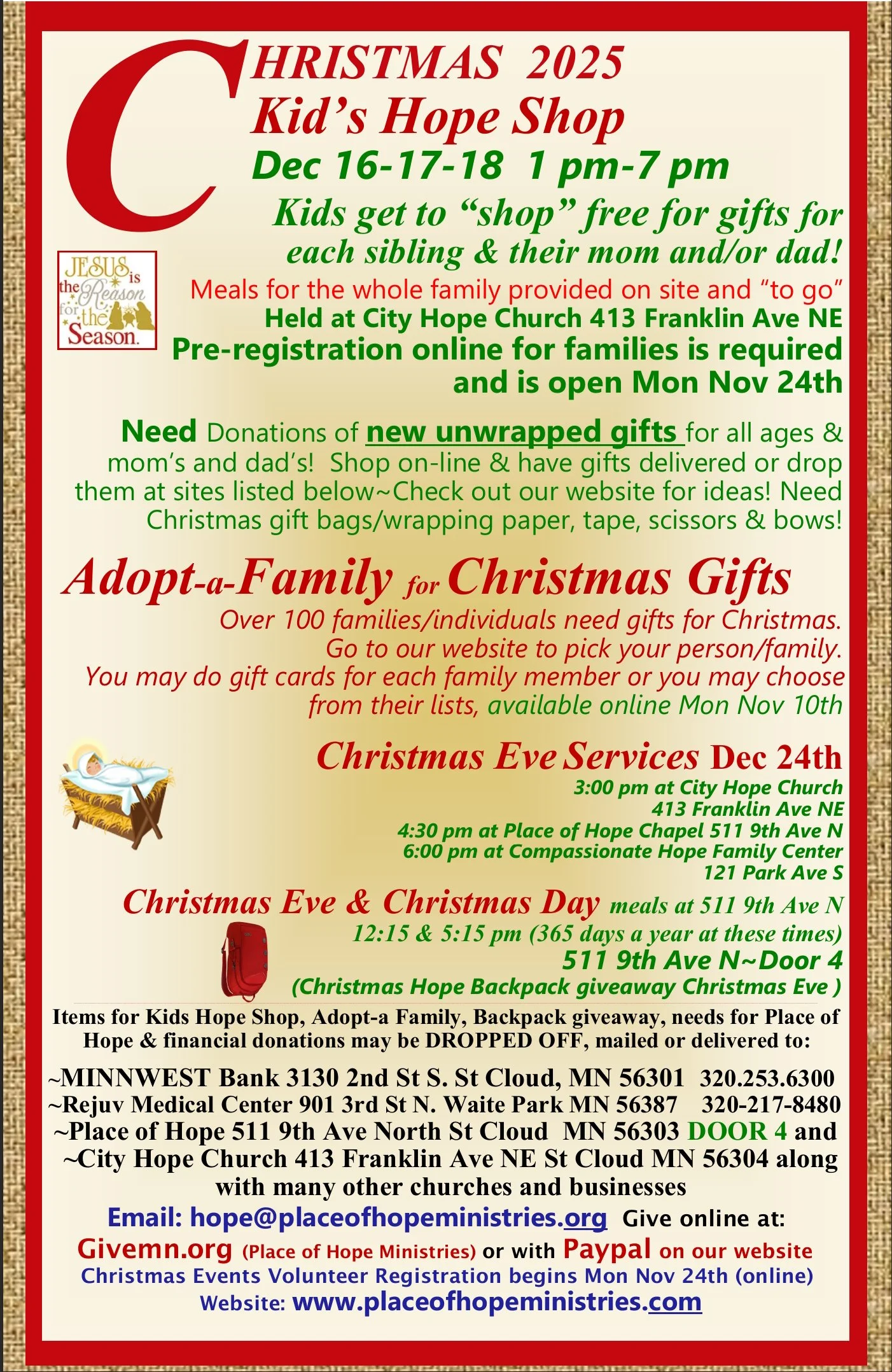 Pre-registration online for families is required and is open online. Volunteers can sign up also online! Go to www.placeofhopeministries.com and click on "Kids Hope Shop"